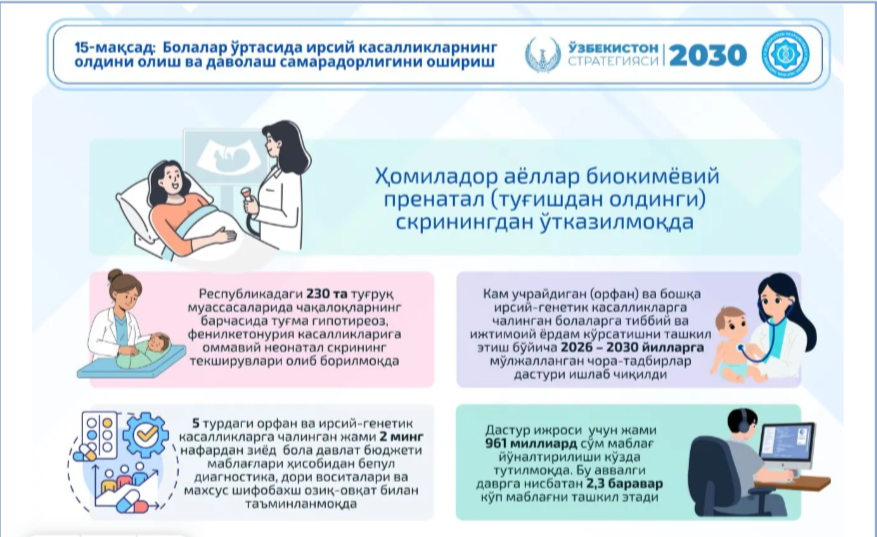 Ushbu infografika 2025 yilda bolalar o’rtasida irsiy kasalliklarning oldini olish va davolash samaradorligini oshirish borasida erishilgan natijalarga bag’ishlangan bo’lib, “O’zbekiston — 2030” strategiyasining 15-maqsadi etib belgilangan.